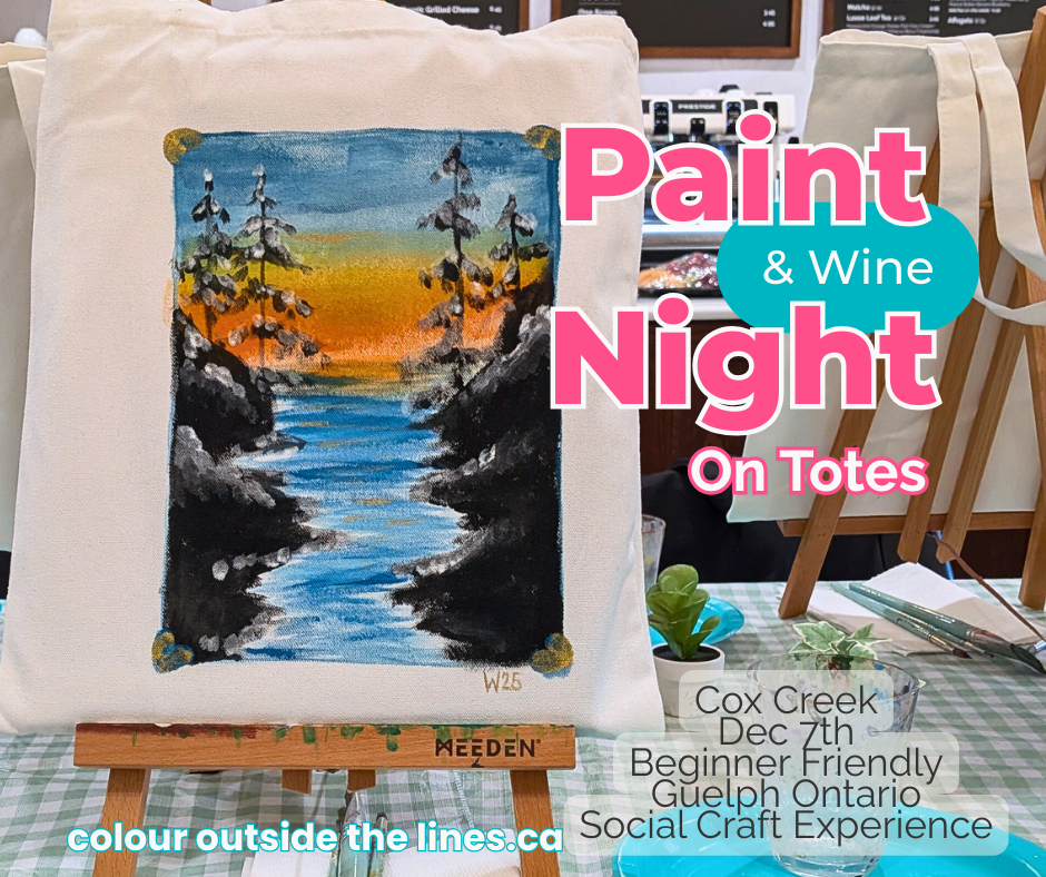 December 7th 1pm - Enjoy an afternoon of painting this Bob Ross inspired Tote. And a glass of wine or cider at Cox Creek Cellars. (Guelph's very own Winery!) 7687 Wellington 22 Guelph, ON N1H 6J2 50$