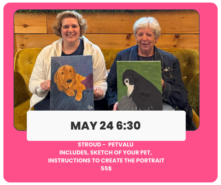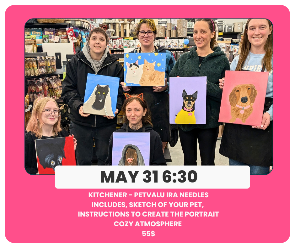 Home Leave a Google Review Tulips Paint NightApril 10 6pm - All levels welcome and beginner friendly. Choose A tote Bag or a Canvas painting. Includes all steps and make it your own! Open Paint Night Cafe Clementina- 17 Benton st Kitchener Ontario- All supplies providecd to create the pinterest worthy tote you've been eyeing Paint my Pet Workshop KitchenerApril 26- PET VALU Stanley Park Mall - All levels welcome and beginner friendly. Email a photo of your pet to colouroutsidethelines.ca@gmail.com Paint my Pet Workshop StroudMay 24 6:30 - 7975 Yonge St, Stroud, ON L9S 1L2 - All levels welcome and beginner friendly. Email a photo of your pet to colouroutsidethelines.ca@gmail.com Paint my Pet Workshop KitchenerMay 31st 6:30 Ira Needles Pet Valu - All levels welcome and beginner friendly. Email a photo of your pet to colouroutsidethelines.ca@gmail.com Please leave this field empty Never miss another class Always have a date night, girls night, kids party, in your back pocket Name * Email Address * We don’t spam! Read our privacy policy for more info. Check your inbox or spam folder to confirm your subscription.